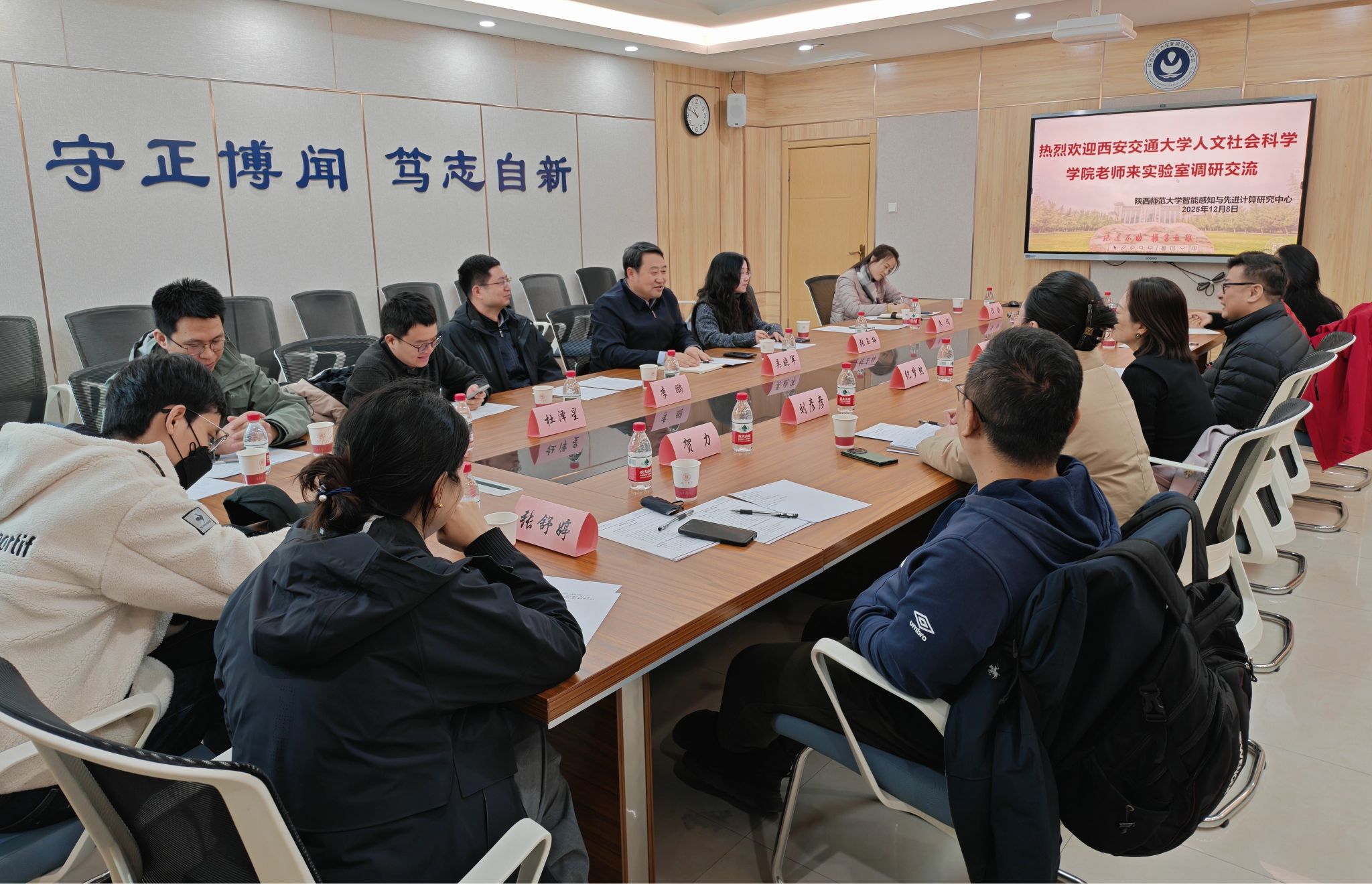 12月8日,西安交通大学人文社会科学学院纪梦然书记带队,多位教师莅临陕西师范大学智能感知学院实验室,开展调研与交流活动。在参观环节,来宾实地考察了实验室科研成果展区,了解了我院在AIGC创作、动作识别等方向的阶段性成果,并体验了相关技术在文化数字化场景中的应用。