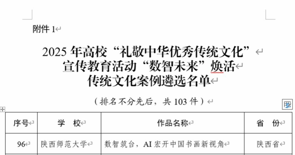 近日,教育部办公厅公布2025年高校“礼敬中华优秀传统文化”宣传教育活动结果,由学校党委宣传部牵头,实验室申报的《数智筑台,AI宏开中国书画新视角》入选“数智未来”焕活传统文化案例。
